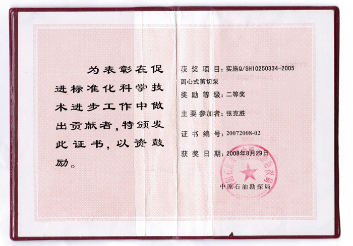 • 剪切泵獲獎證書